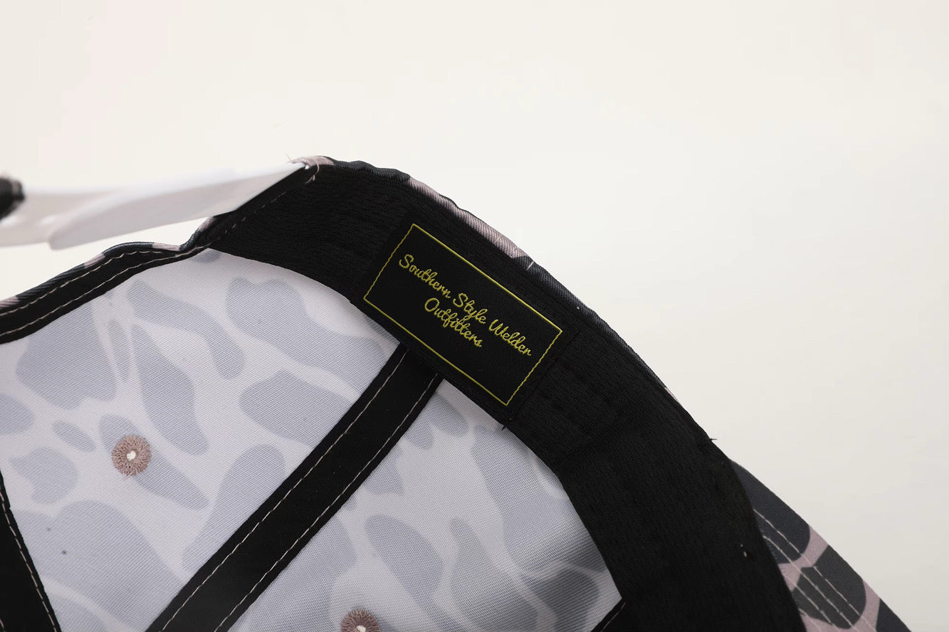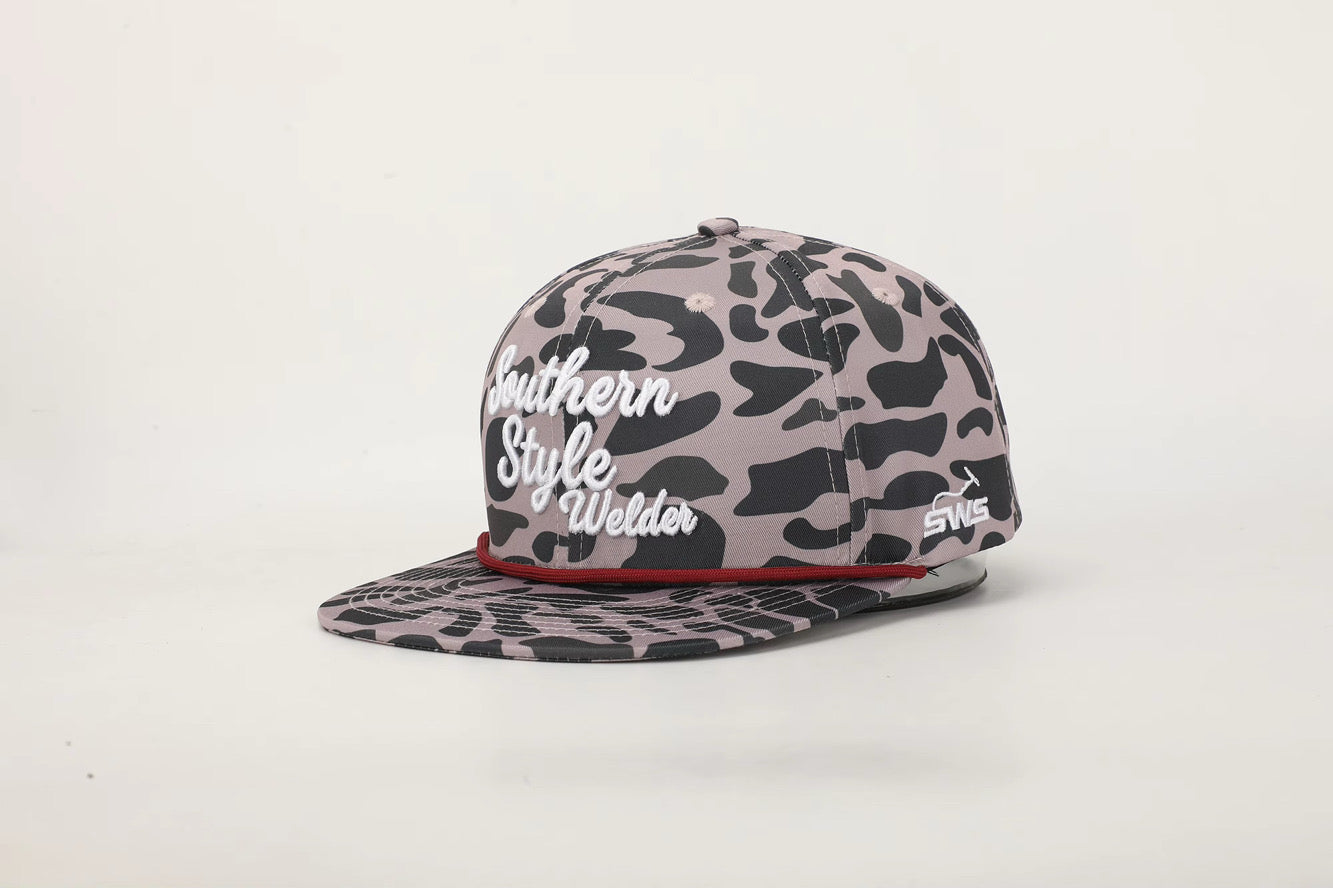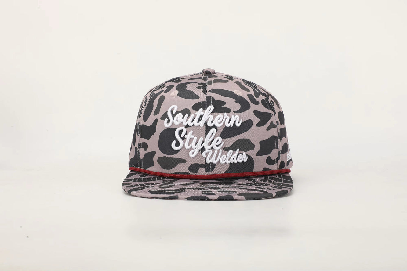 This one’s for the ones who live under the hood and don’t mind getting it dirty. The Black Camo “Southern Style Welder” hat brings a tough, clean look with bold raised white embroidery and a maroon rope that sets it off just right. Built with a structured crown and flat bill, it’s made to hold its shape and wear hard—on the job, in the truck, or out on the weekend.